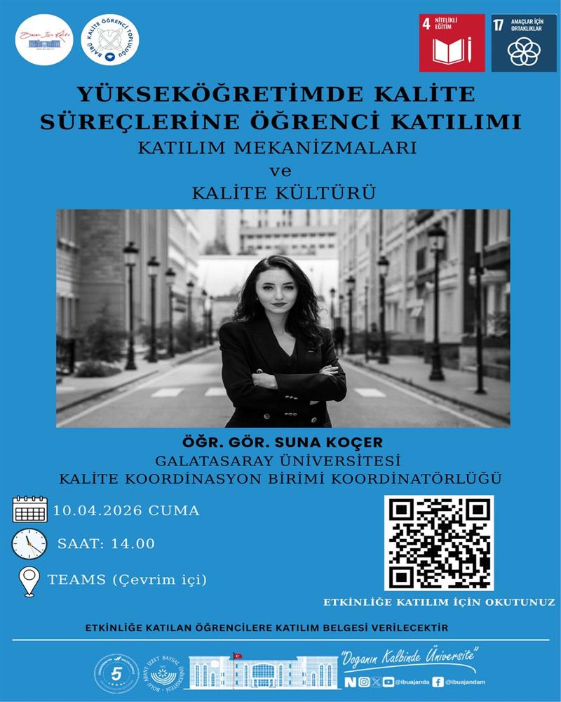 Öğr. Gör. Suna Koçer tarafından gerçekleştirilecek bu çevrim içi etkinlikte; öğrenci temsiliyeti, geri bildirim mekanizmaları, kalite komisyonlarına katılım ve kurumsal gelişimde öğrenci katkısının önemi gibi konular detaylı bir şekilde değerlendirilecektir.